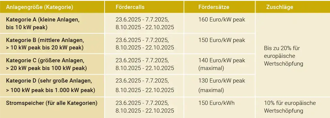 In der folgenden Tabelle finden Sie einen Überblick. Welche Möglichkeiten sich für Sie genau ergeben, welche weiteren Unterstützungen es gibt, das erfahren Sie am besten bei den auf das Förderwesen spezialisierten Experten aus dem Kerntema - mit jahrelanger Erfarhung von tausenden Anlagen.
